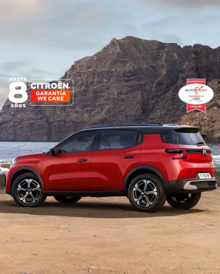 (5) Oferta financiera de 36 mensualidades y 30.000 km. Nuevo C3 Aircross Turbo 100 S&S PLUS con precio financiando de 19.940,00€ en Península y Baleares para clientes particulares que financien mínimo a 36 meses a través de Stellantis Financial Services España EFC, S.A. Incluidos impuestos, transporte, descuentos. Sujeto a aprobación financiera. Entrada: 5.219,67€. Mensualidad de 139€ que se compone de una cuota financiera mensual para una duración de 35 meses de 125,20€ y de un seguro de crédito de 13,80€ al mes. Última cuota: 13.987,11€. Capital financiado con comisión de apertura: 15.301,78€. Comisión de apertura (3,95%): 581,45€. Intereses: 3.067,33€. Coste total del crédito: 3.648,78€. Importe total adeudado: 18.369,11€. Precio total a plazos: 23.588,78€. TIN: 6,99%. TAE: 8,84%. Sistema de amortización francés. Al final del contrato podrá elegir entre entregar su vehículo, o abonar o refinanciar la última cuota. Oferta válida hasta el 28/02/2026. Precio al contado: 20.240,00€. El modelo visualizado puede no coincidir con el ofertado. Seguro de Crédito opcional (13,80€ al mes) incluido en las mensualidades y no en el capital financiado, suscrito con Stellantis Life Insurance Europe Limited, con el nº de registro C68966 y con domicilio social en MIB Housse, 53 Abate Rigord Street, Ta’ Xbiex, XBX1122 Malta, como compañía de seguros, y con la intermediación de Stellantis Financial Services España, EFC SA, agente de seguros vinculado inscrito en la Dirección General de Seguros y Fondos de Pensiones con la clave AJ-171 y con Seguro de Responsabilidad Civil contratado. Sujeta a normas de suscripción de la aseguradora. Consulte condiciones en www.citroen.es.